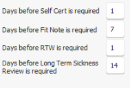 The 'Self-Certifications', 'Fit Notes', 'Long Term Sickness Review' will self populate with 'Required/Needed' based on the configurations in Configuration>Default Settings>Defaults: