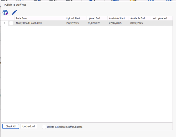 Once this is done, we click on the little globe icon to upload the shifts to the Log Availability section of the staff Web Portal. Here's a guide for staff on Logging Availability.