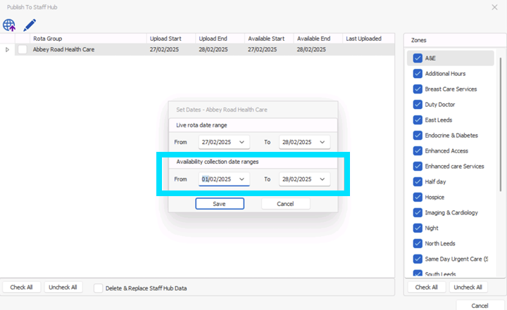 Once we have a new, blank rota created, we upload the new month's sessions to the Staff Hub using the Rota Upload facility. This is found under Rota > Rota Upload. We double click on the Rota Group that we want to open Availability for and set the 'Availability collection Date Ranges' to the new rota period.