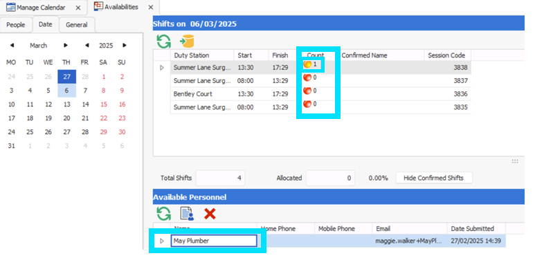 The 'Shifts' panel will show any shifts on that day, and the 'Count' column shows how many staff have logged availability for the shift. Down in the bottom 'Available Personnel' panel, we can see the names of the staff that have logged, along with their contact details and the date that they submitted their request.