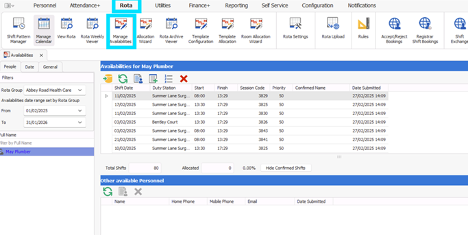 To allocate sessions manually, based on availability, we go to the Rota > Manage Availabilities screen.