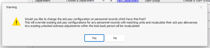 Yes: This will override existing configurations for any personnel with matching units and recalculate their sick pay allowances. Only unlocked sickness adjustments within the look-back period will be recalculated.