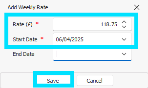 Input the 'Rate(£)' and 'Start Date', and click 'Save'.