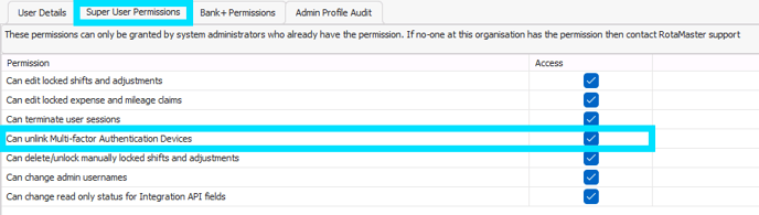 Click on 'Super User Permissions', enable the 'Can unlink Multi-Factor Authentication Devices' setting by ticking the access box.