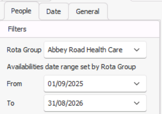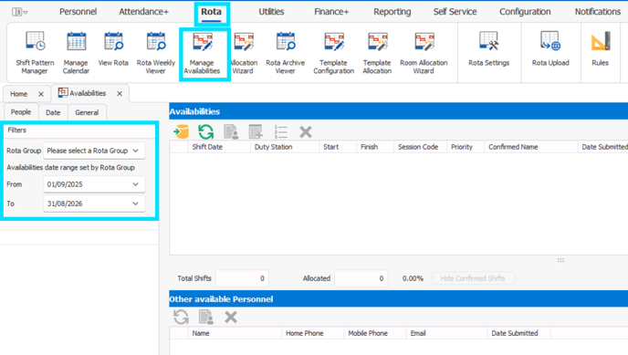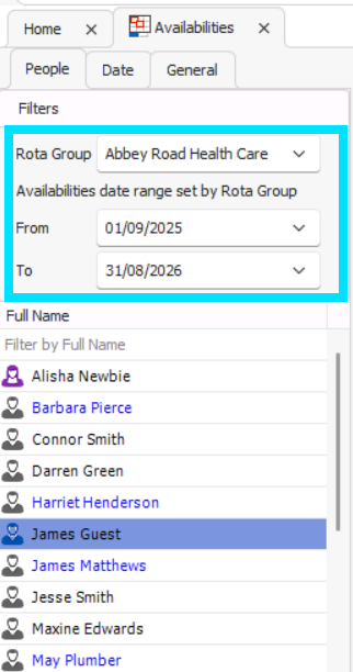 Using the filters on the left hand side choose a 'Rota Group' and 'Availabilities date range' to bring up a list of Personnel: