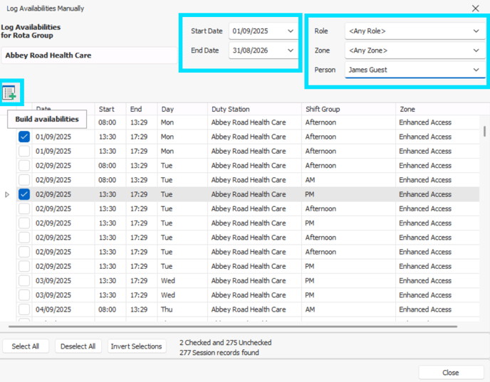 Tick the box to the left of each shift that you would like to create availability for, and press the 'Build Availabilities' button.