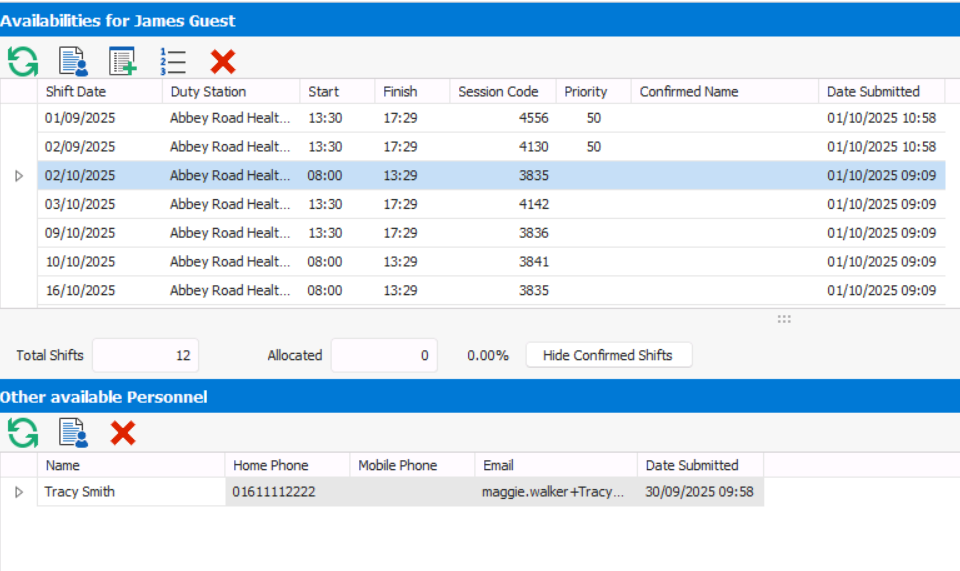 Should you wish to allocate to a staff member in the 'Other available personnel' section, ensure you are clicked on that staff member before clicking the allocate button.