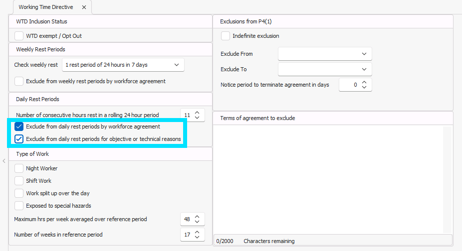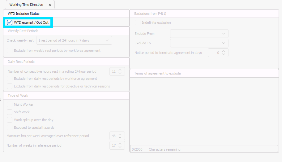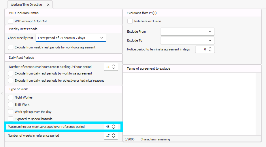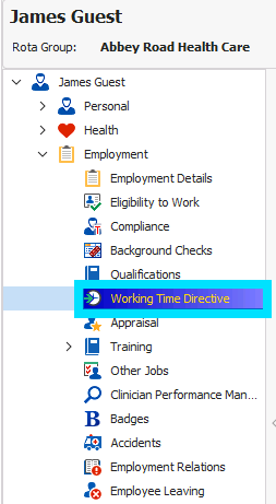 The WTD record for each person is configured in each person's Personnel Record under 'Employment > Working Time Directive'.